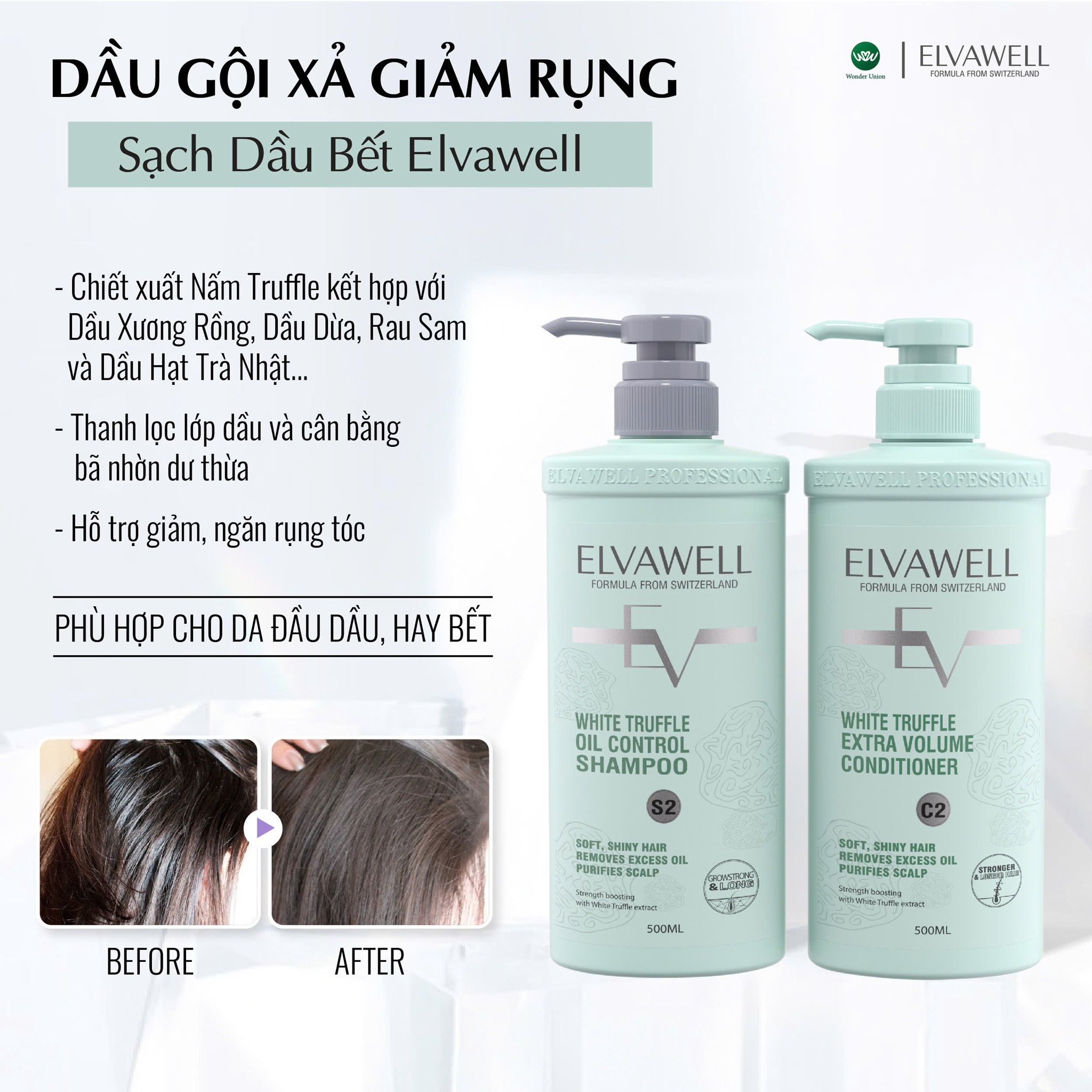 Dầu Gội Giảm Rụng Tóc Sạch Dầu Bết Elvawell 500ml - 1000ml